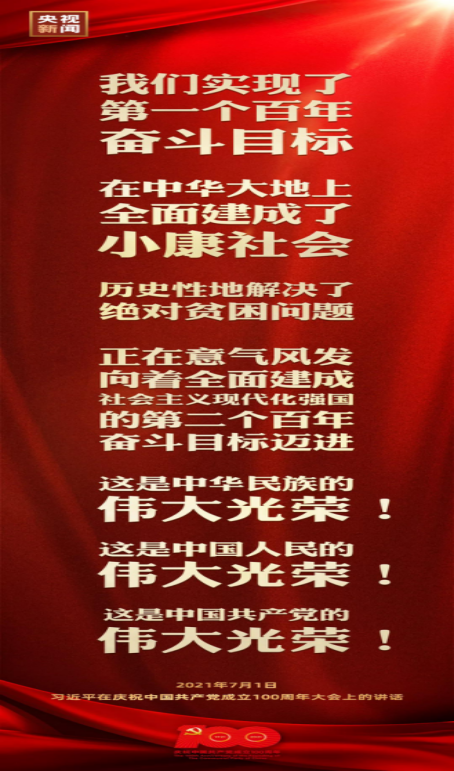 “中国共产党立志于中华民族千秋伟业,百年恰是风华正茂!回首过去,展望未来,有中国共产党的坚强领导,有全国各族人民的紧密团结,全面建成社会主义现代化强国的目标一定能够实现,中华民族伟大复兴的中国梦一定能够实现!”