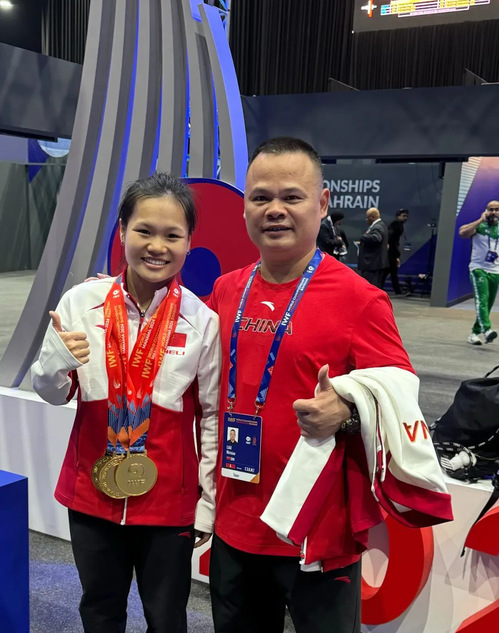 赛后,领取3枚金牌的赵金红(左)与广西女子举重队教练廖伟啸(右)开心合影。广西举重运动发展中心供图