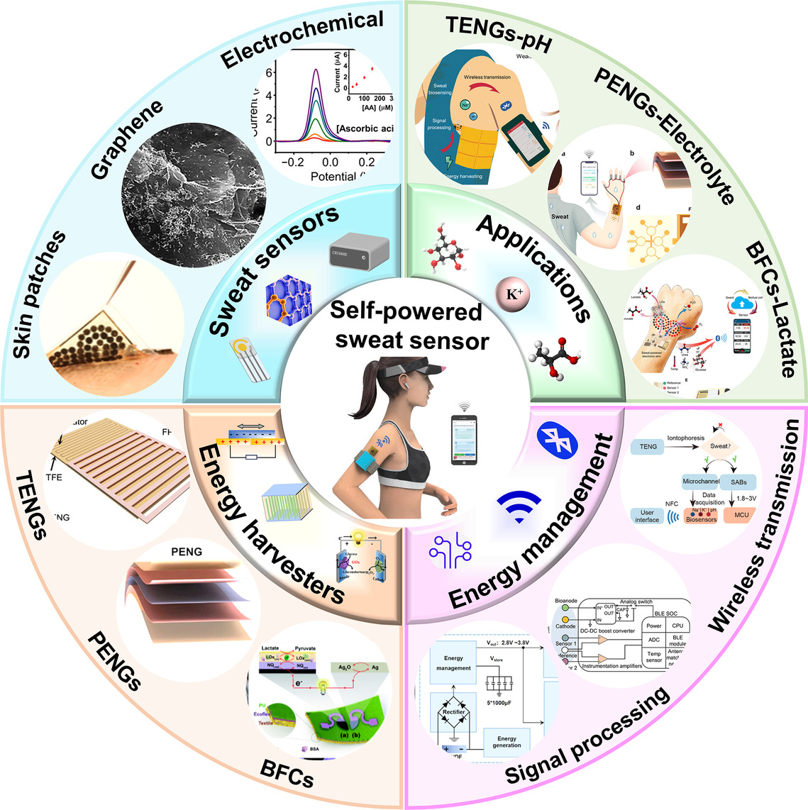 图2. 自供电汗液传感器在材料、设备、能源、功能和应用方面的前景
