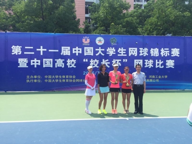 7月24日,第21届全国老员工网球锦标赛在河南省郑州大学开赛。本次比赛共有全国各地8个赛区,193所大学,800多名教练员、运动员参加。公司女子网球队(betway西汉姆联官方网站运动训练专业杨馨、杨嘉琦、王泳缘、江心怡)在陈尊、刘威两位网球专业教师的带领下,一路过关斩将,以全胜战绩勇夺女子丙组(体育院校)团体项目冠军,这也是公司开展网球运动以来获得的首个全国大赛的冠军奖杯。