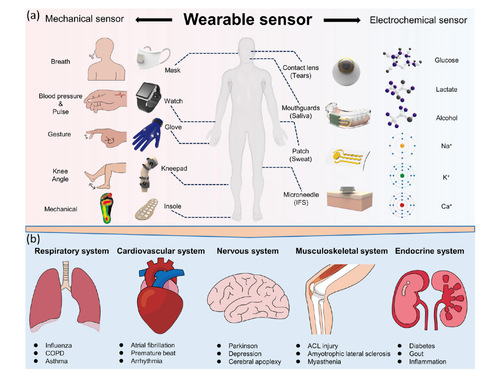 该研究深入剖析了可穿戴机械和电化学传感器的工作机制,详细介绍了其在疾病监测中的广泛用途。通过巧妙整合传感器与日常穿戴产品,如口罩、手表、手套等,实现了对呼吸、脉搏、关节运动等多种生理信号的实时监测。这些创新设计不仅拓展了监测目标范围,而且显著提升了监测的便捷性和舒适性。