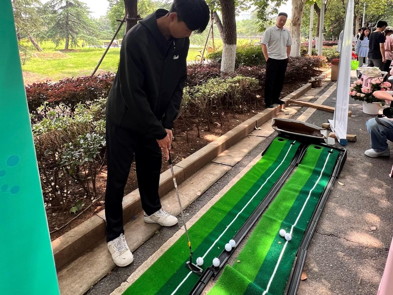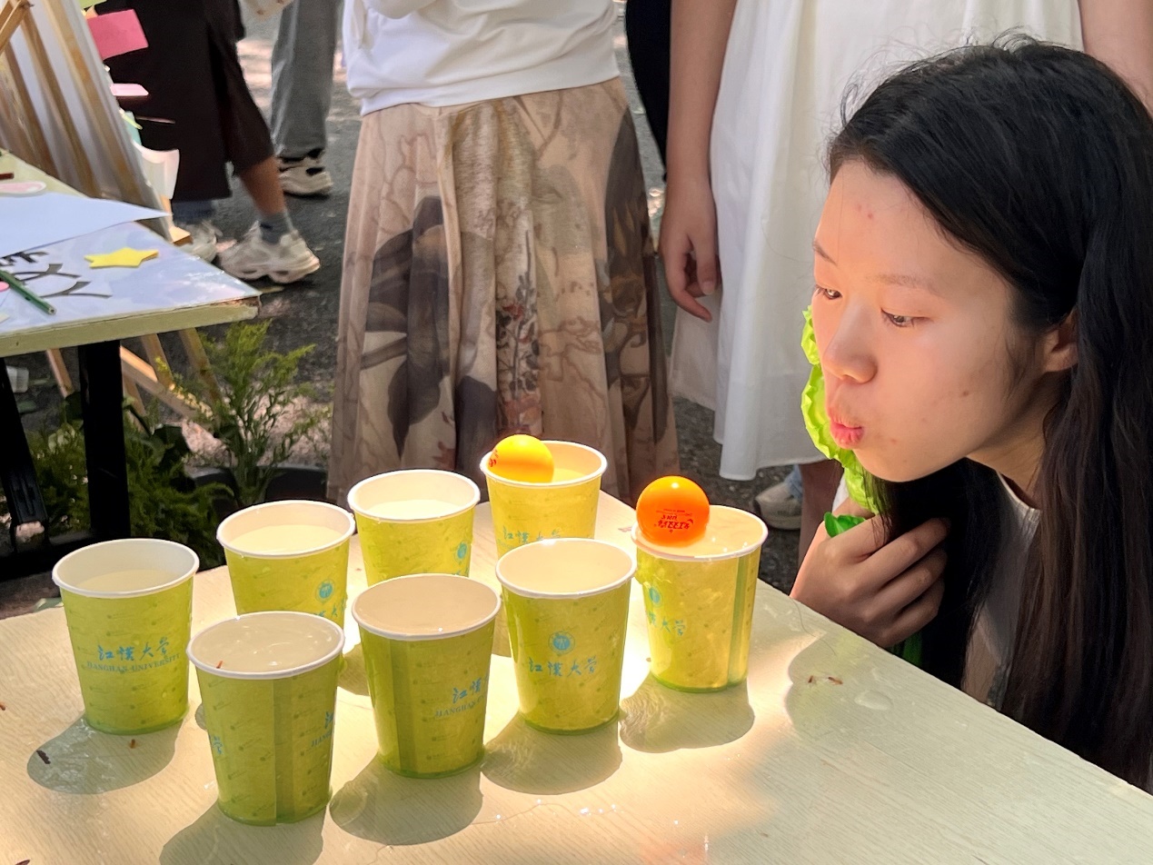“趣挥一夏”的迷你高尔夫场边,同学们化身“绿茵绅士”,推杆送球的瞬间仿佛在与焦虑对话——当白球轻盈滚入洞口,前两次挑战成功的幸运儿举起奖品欢呼,而三次尝试后的“安慰奖”糖果,也让笑声融化了“未达标”的小失落。最具创意的“心乒气和”项目中,选手们深吸一口气,将“开心”“平静”等情绪词化作气流,吹动乒乓球在纸杯间“跳跃”。当小球稳稳落进第三个杯子时,欢呼声与掌声交织,仿佛将积压的烦恼都“吹”向了云端。