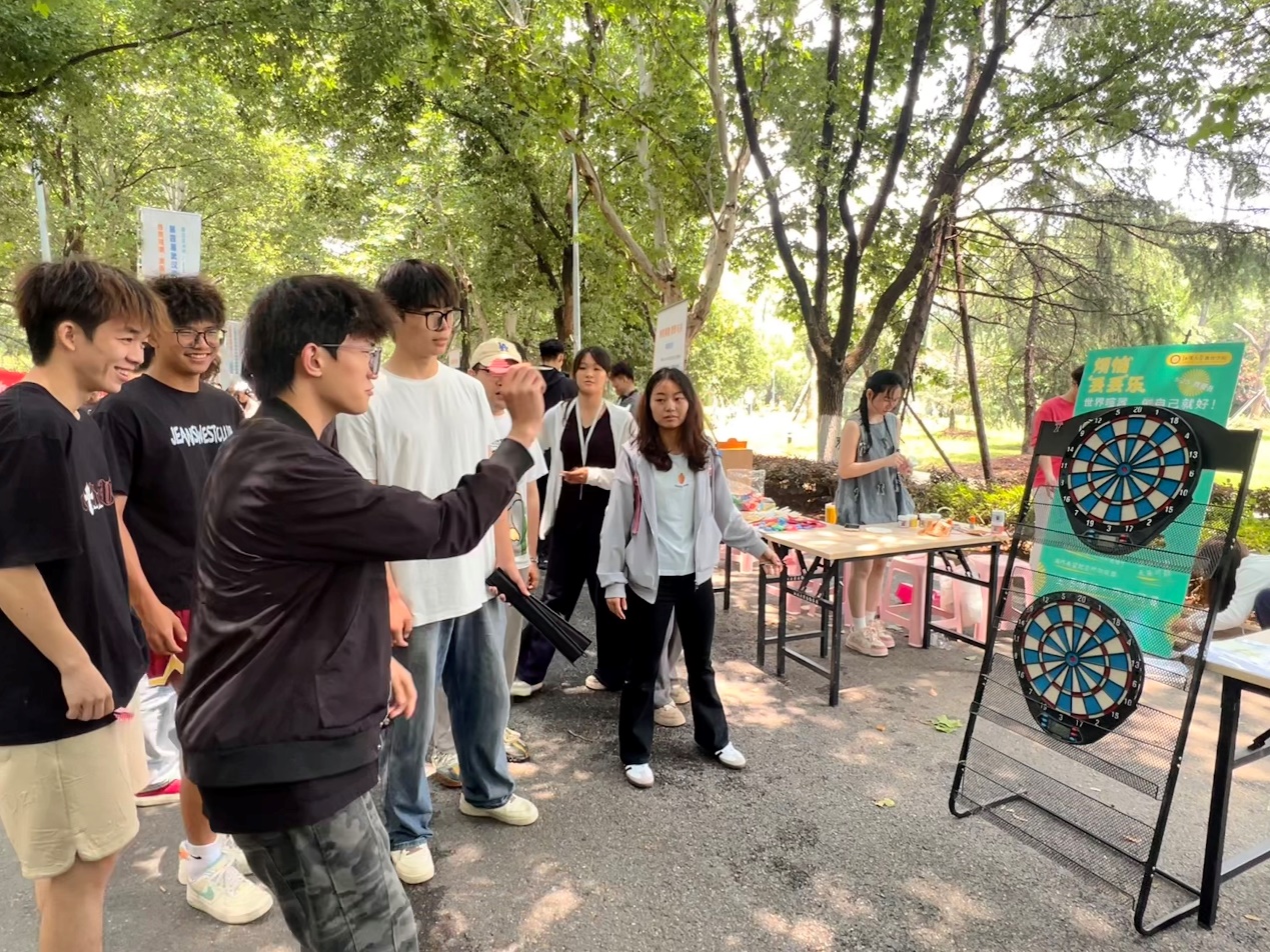 活动现场设置的三大创意关卡,将运动竞技与心理疗愈巧妙融合,成为同学们释放情绪的“能量转换站”。在“镖准拿捏”区,飞镖划破空气的“咻咻”声此起彼伏,挑战者屏气凝神瞄准靶心,当金色飞镖稳稳扎进红色圆心时,围观人群爆发出欢呼——3次投掷机会里,无论是“全中指定区域”的精准把控,还是“一镖穿心”的幸运时刻,都让压力随飞镖一同“钉”在靶盘上。