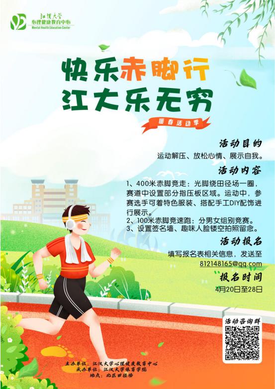 健康提醒 | 1.有疾病史或疾病急性期的同学,请遵照医嘱; 2.请提前进行光脚适应练习和运动; 3.赛前保持合理饮食、充足睡眠; 4.百米竞赛时,应着合身的运动服,防止意外发生。 本次活动具有一定运动量,请结合自身实际身体情况报名,量力而为,不宜勉强。 | |||||