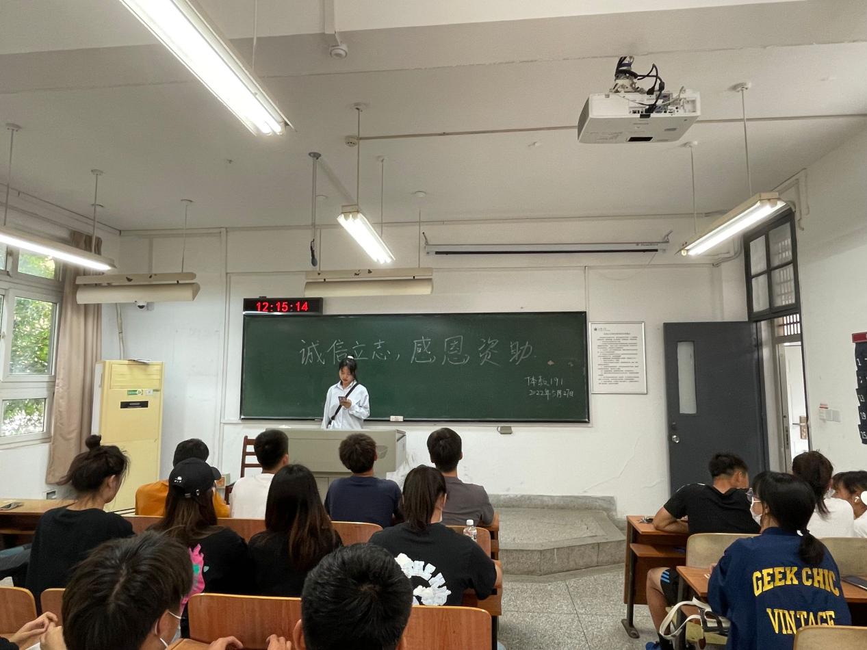 (图为19体教班召开以“诚信立志-感恩资助”为主题的学习分享会)