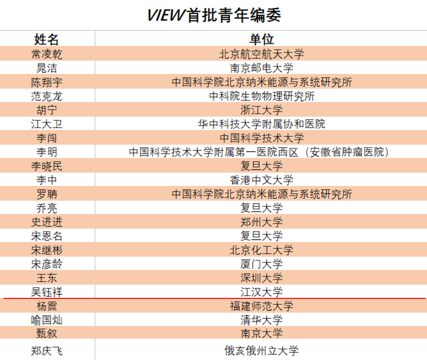 近日,VIEW期刊编委会遴选并公布了首批22名青年编委,公司吴钰祥教授成功入选。据悉,本次青年编委会的招募收到了全球众多学者的申请,经过编辑部的初选、线上交流会和编委会的慎重讨论,最终确定了编委名单。公司吴钰祥教授的入选,将对公司在体医融合领域的高质量发展和影响力提升起到积极作用。