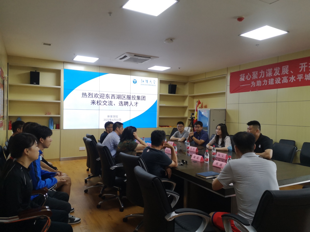 公司党委书记张琮玫、副书记潘心纲和足球教练谢超相关负责老师及毕业生代表在小球馆208会议室参加了人才招聘座谈会。