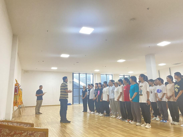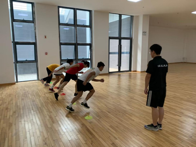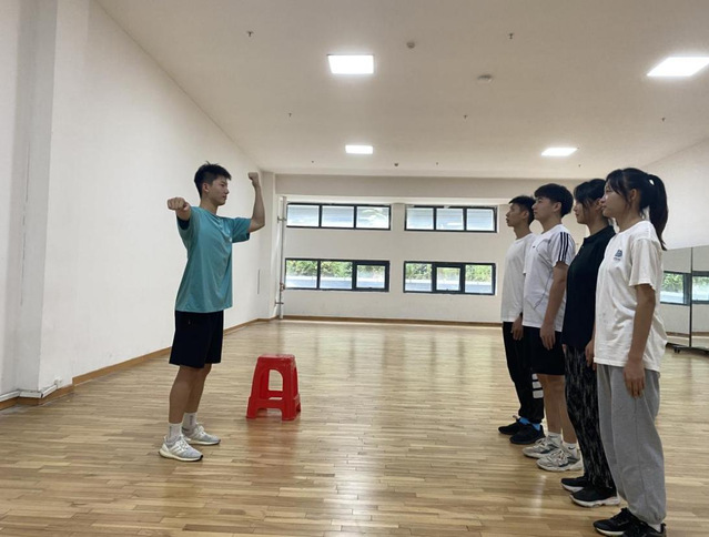 本次培训的主要内容分为队列队形、哨声口令、中小员工广播体操、五步拳和长拳、模拟上课、教学教案六个部分。培训期间以小组为单位分组练习,各组内齐心协力、互相帮助,力争做到口令声音洪亮、广播体操动作优美、五步拳和长拳动作连贯有力。在模拟上课练习过程中,同学相互学习共同点评,不断提升上课水平。培训期间朱欣华老师莅临现场观摩各培训小组的练习情况并进行了专业指导。