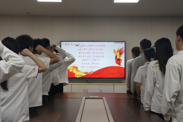 接下来由老团员代表带领新团员宣誓,新团员们举起右手庄严宣誓,铿锵有力的誓言响彻整个会场,表达了他们为共产主义事业而奋斗的决心。