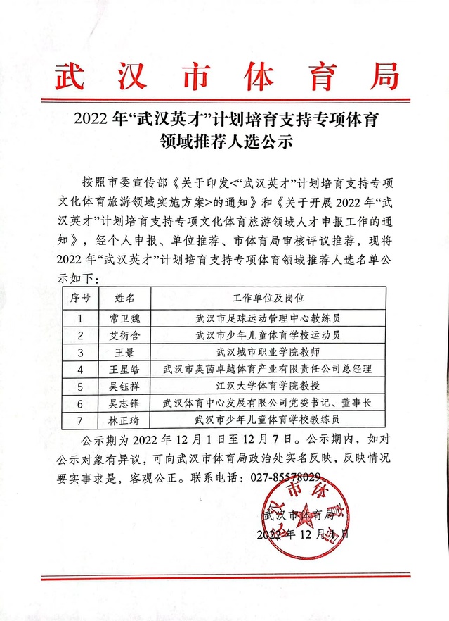 2022 年“武汉英才”计划培育支持专项体育领域推荐人选公示