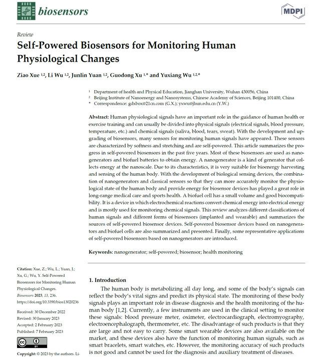 近日,公司运动人体科学团队2021级硕士研究生薛子傲以第一作者在SCI期刊《biosensors》(JCR一区,中科院三区,IF=5.743)发表题为《Self-Powered Biosensors for Monitoring Human Physiological Changes》的学术论文。指导教师吴钰祥教授、徐国栋教授为共同通讯作者。江汉大学为第一作者单位和第一通讯单位,中国科公司北京纳米能源与系统研究所为共同单位。