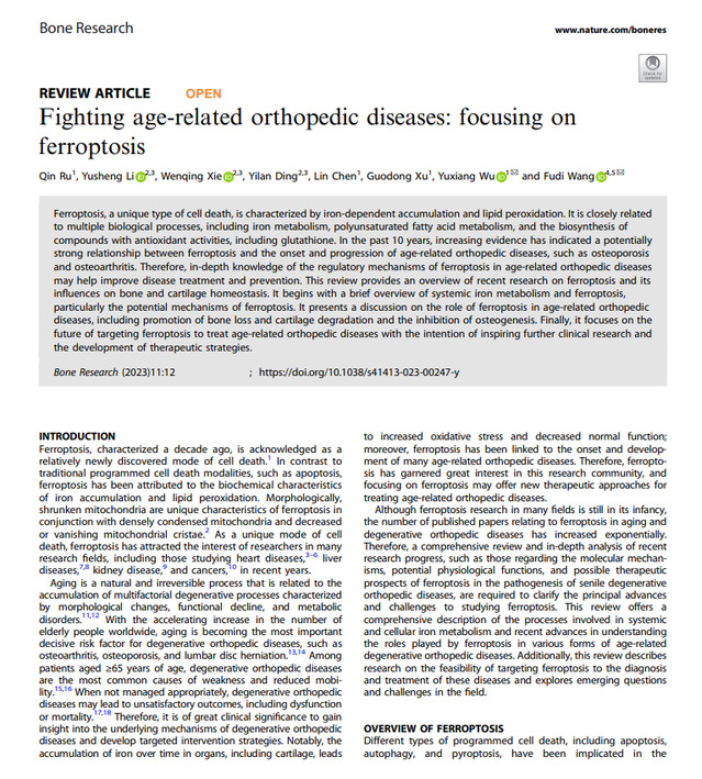 近日,公司吴钰祥教授团队在国际顶级期刊《Bone Research》(中科院SCI一区TOP,影响因子13.36)发表了题为《Fighting age-related orthopedic diseases: focusing on ferroptosis》的重要研究成果,并被选为期刊封面文章。该文章系统总结了铁的代谢和铁死亡的调控机制及其在退行性骨疾病中的最新进展,全面总结了骨系统中铁死亡与凋亡、自噬等死亡方式的交互作用,为探索新型退行性骨疾病防治策略打下坚实的理论基础,并展望了该领域未来的发展方向。茹琴副教授为该论文的第一作者,吴钰祥教授为该论文的第一通讯作者,betway西汉姆联官方网站为第一作者单位和第一通讯单位。
