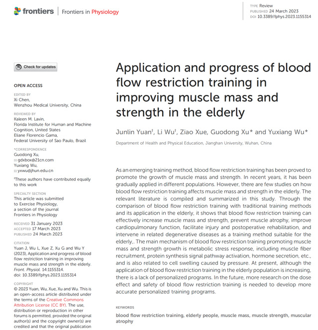 近日,公司2021级硕士研究生苑峻琳以第一作者在生理学领域国际知名期刊《Frontiers in Physiology》(JCR 1区,中科院2区TOP,IF=4.76)发表题为“Application and progress of blood flow restriction training in improving muscle mass and strength in the elderly”的学术论文。其中,2020级研究生吴礼为共同第一作者,指导教师吴钰祥教授、徐国栋教授为共同通讯作者,betway西汉姆联官方网站为第一作者单位和第一通讯单位。