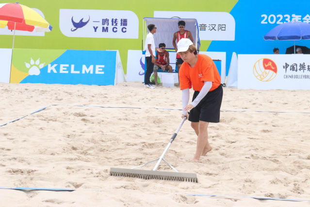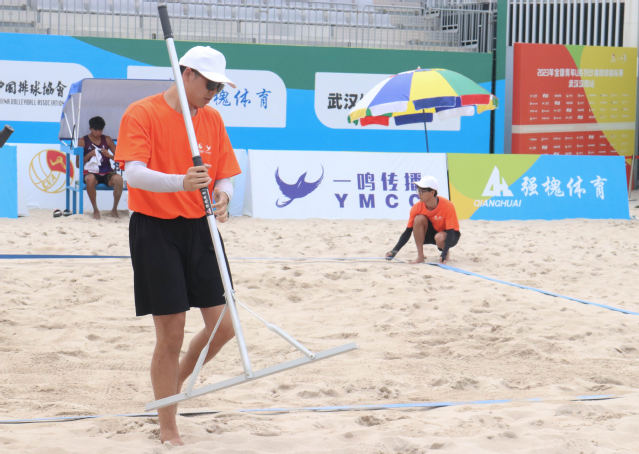 17日比赛正式开始后,志愿者们每天大多6点就起床,7点20统一集合乘大巴车到达赛场,尽管彼时武汉的气温已经接近30度,沙滩地面的温度高达近60度,志愿者们还是拿出了自己最大的热情服务赛场。赛场上,运动员们上场奋战,志愿者们也没停下脚步,场馆各个角落,随处可见他们忙碌的身影,哨声一响,抄起平沙耙,迅速冲向场上,重心向下,快速跑动,利用沙耙将沙滩整平,整个动作一气呵成。联络员、捡球员包括器材室的后勤保障志愿者,虽然每天顶着烈日,迎着高温,但他们各司其职、一丝不苟,以真诚细致、热情周到的态度,给运动员和工作人员提供了良好的赛会志愿服务体验,他们用汗水展现青春力量。