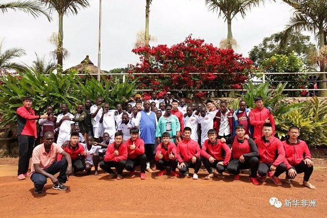 长沙市麓山滨江实验公司龙舟队队员和乌干达龙舟队成员合影。新华社发(阿佳拉·纳瓦达摄)