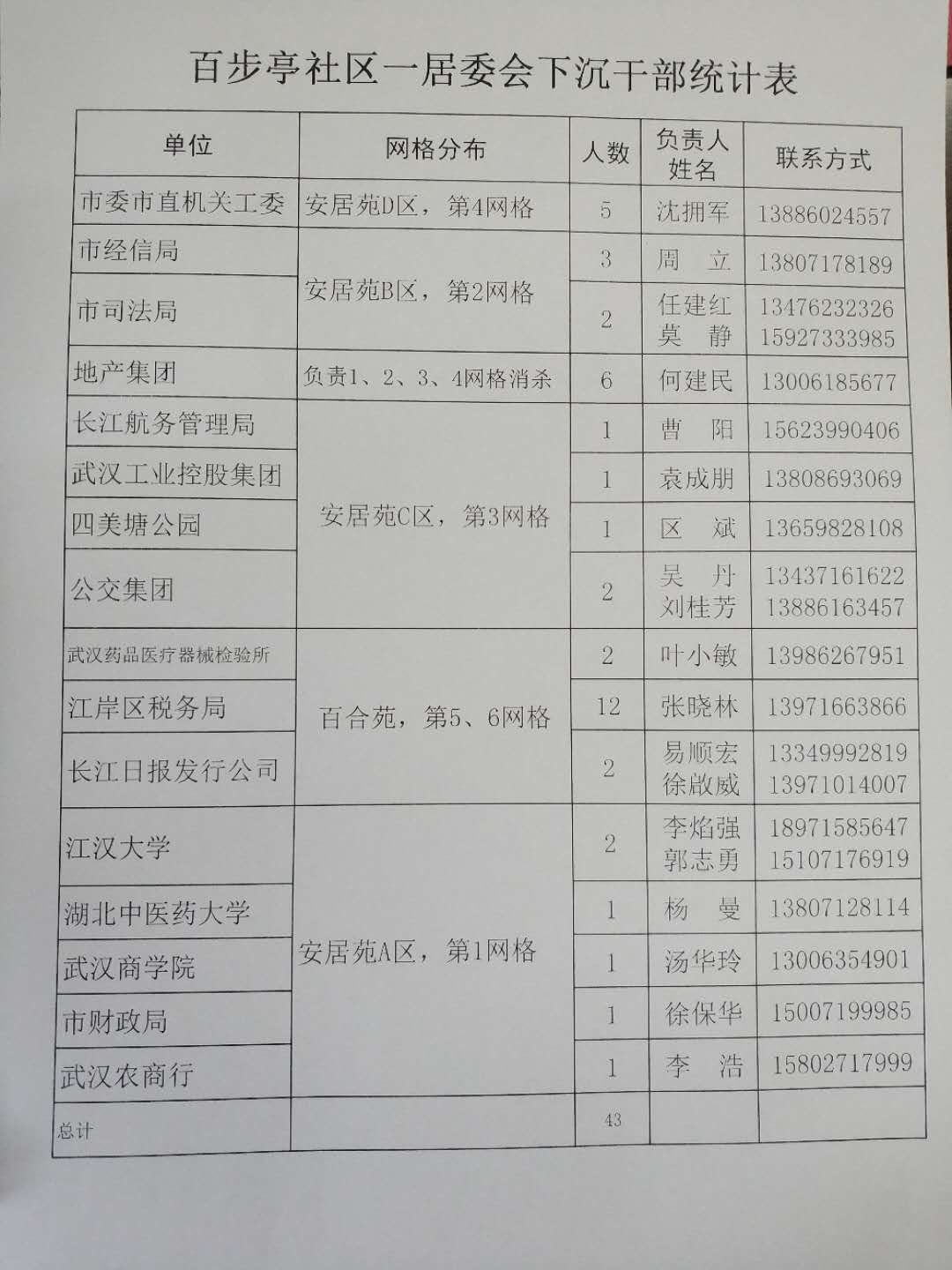 疫情就是命令,防控就是责任。公司在汉教职工积极响应,按“应下尽下,近就就便”的原则分别下沉到江岸区百步亭社安居苑总支部委员会、江岸区塔子湖街道美联社区、徐东社区、新洲区江山湾等16个不同社区。他们协助社区做好居民健康状况筛查,做好出入人员管理检查记录,配合做好环境整治、日常消杀,生活用品代买等疫情防控工作,积极为社区疫情防控贡献力量。