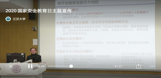 组织师生收看专家访谈片。通过长江云同步直播收看《生物安全与公共卫生安全专家访谈》视频,并开展线上讨论交流学习。“什么是生物安全,我们国家生物安全的现状如何?”主持人开门见山、直入主题。访谈专家关武祥副所长介绍,生物安全是国家总体安全的重要组成部分,属于非传统安全范畴。其内涵通常包括“五防两保”,即:防控新发突发传染病,例如非典、禽流感和这次的新型冠状病毒疫情;防范生物恐怖袭击;防御生物武器攻击;防止生物技术谬用;防控外来生物入侵;保障实验室安全和保护人类遗传资源等七个方面。