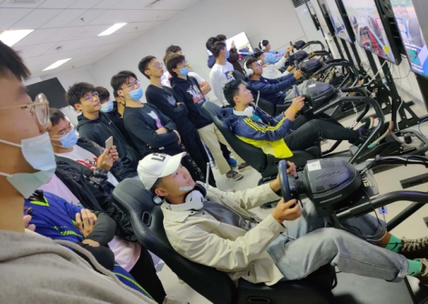 在进行简单的示范操作之后,大一新生就开始了第一次赛车驾驶模拟。坐上模拟驾驶器,“音、语、视、控、振”五位一体的感受随及而来。